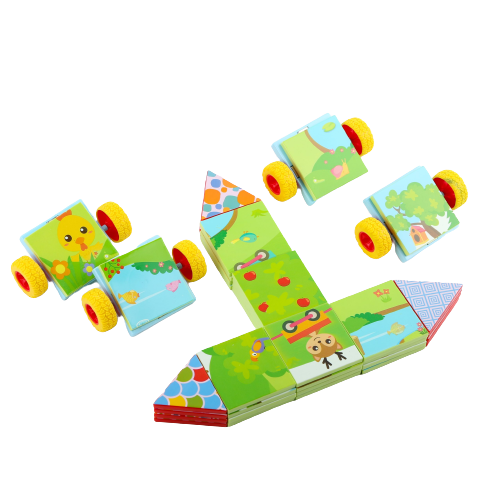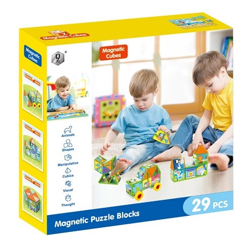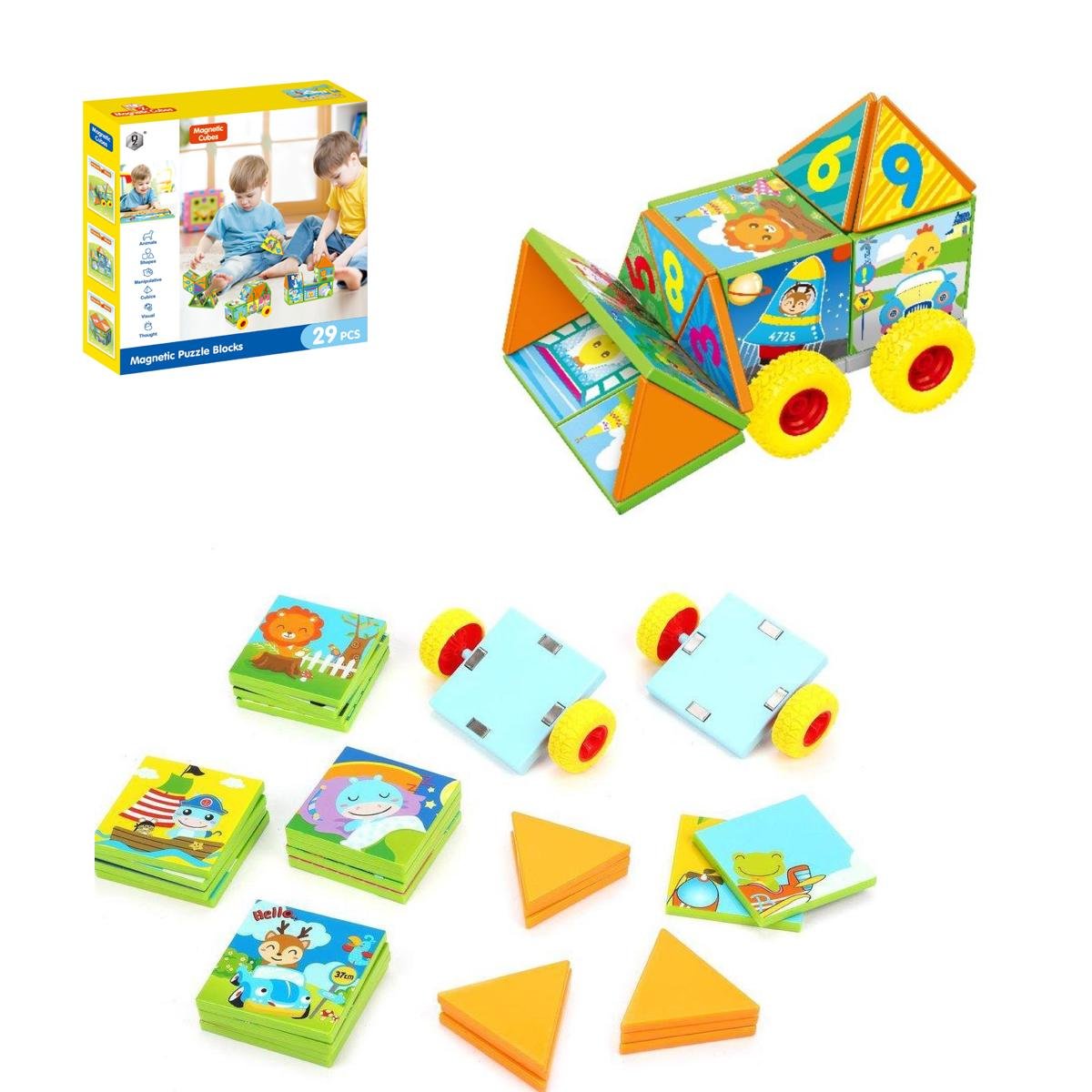 Blocs de construction et puzzles magnétiques – 29 pièces Il s’agit d’un jouet de construction magnétique éducatif, créatif et amusant pour petits et grands. L’ensemble se compose de 29 pièces magnétiques, dont 9 plates-formes triangulaires, 18 carrées et 2 roues conçues pour créer de beaux modèles en forme de voiture, de maison, etc. Cet ensemble de blocs magnétiques permet à vos enfants de construire d’autres modèles au gré de leur imagination. Structures de formes différentes dont la complexité évolue avec l’âge de votre enfant.
