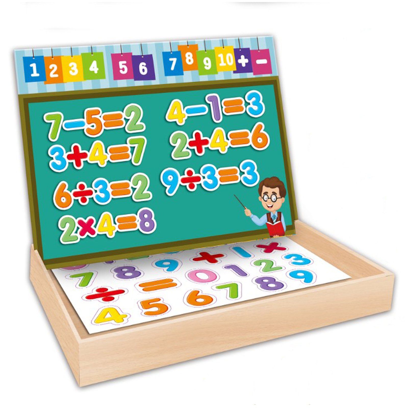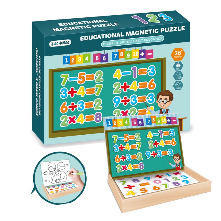 Tableau magnétique éducatif pour les enfants Jeu de puzzle magnétique éducatif Le jeu se compose de numéros de tableau blanc et de symboles de comptage magnétiques – cartes d’addition, de multiplication, de soustraction et de division simple, et il y a des supports de stockage en bois pour qu’il soit facile d’organiser les jeux.