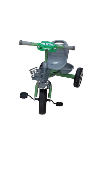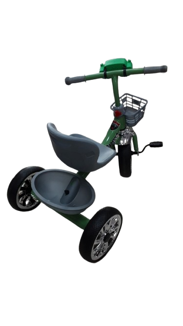 Un tricycle au design moderne et sportif, parfait pour les petits amateurs de conduite. Avec son guidon décoré de lunettes rigolotes, ses roues chromées et son panier avant, il offre style, confort et praticité.